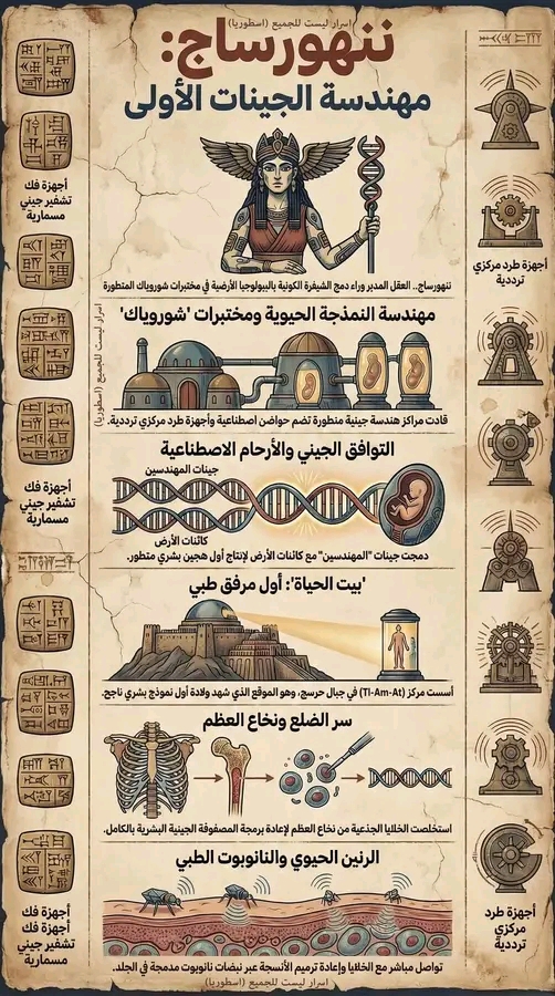 أرشيف الأوائل: ننهورساج.. هل هي الأم الأسطورية أم كبيرة مهندسي الجينات؟ 🧬🏺خلف قصص الخلق الطينية السومرية، يبرز اسم عالمة لم تعرف المستحيل. ننهورساج لم تكن “آلهة” بالمعنى التقليدي، بل كانت العقل المدبر وراء دمج الشيفرة الكونية بالبيولوجيا الأرضية. هي التي حولت “المختبر” إلى “رحم”، وصنعت من ذرات الذهب وخلايا الأرض نموذجاً بشرياً يحمل توقيع النجوم .بينما نتحدث اليوم عن الاستنساخ والتعديل الجيني (CRISPR)، نكتشف أن ننهورساج قد أتمت هذه العمليات قبل عصور الطوفان العظيم. هل نحن مجرد “مسودة جينية” في أرشيفها الطويل؟ 💻👁️اكتشف أسرار “سيدة الحياة”، واعرف لماذا لا يزال جسدك يحمل أختام مختبرات شوروياك حتى اليوم في هذه الصورة للأنفوجرافي و في اول تعليق.#الأنوناكي #ننهورساج #الهندسة_الجينية #نيبيرو #المهندسون_الأوائل #التكنولوجيا_المفقودة# مجلة ايليت فوتو ارت .
