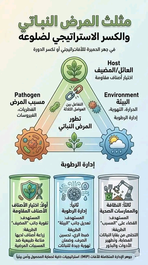 3️⃣: النظافة والممارسات الصحية (Hygiene)الهدف: القضاء على “المسبب”.الطريقة: التخلص من بقايا النباتات المصابة، وتطهير أدوات التقليم، وضمان نظافة البذور. هذه الخطوات تقلل من كمية اللقاح المعدي الموجود في الحقل.♻️الخلاصةإن فهم هذا المثلث هو جوهر الإدارة المتكاملة للآفات (MIP)؛ فهي لا تعتمد فقط على المبيدات الكيميائية، بل تعتمد على استراتيجيات ذكية لتغيير الظروف البيئية أو تحسين جودة النبات لمنع اكتمال أضلاع المثلث، وبالتالي حماية المحصول بأقل التكاليف وبأمان بيئي أكبر.هل تود الحصول على تفاصيل أكثر حول كيفية التعامل مع مرض محدد يصيب أوراق النباتات؟#الصيدلية_الزراعية_دار_الفلاحة#مجلة ايليت فوتو ارت .