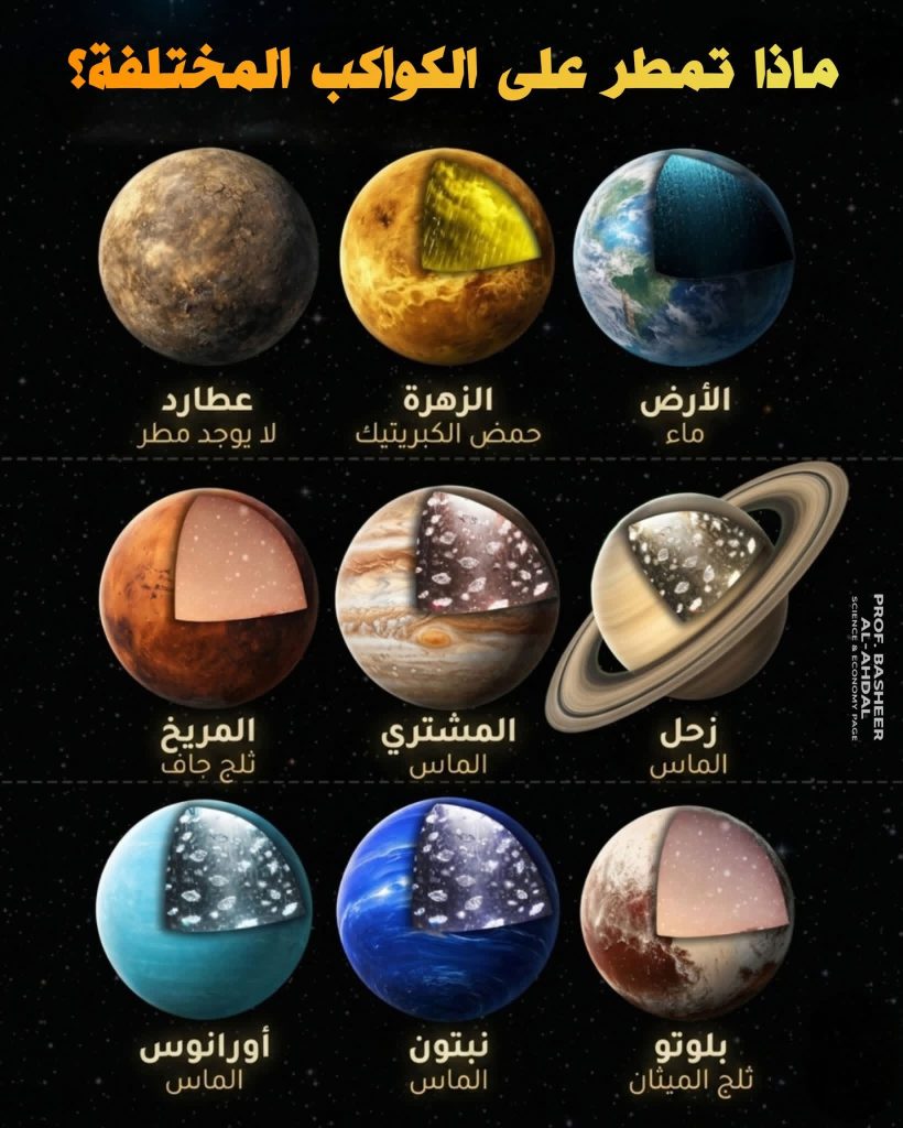 في النظام الشمسي، لا يوجد مفهوم واحد للأمطار؛ فكل كوكب يفرض قواعده الخاصة بناءً على غلافه الجوي ودرجات حرارته وضغطه. على الأرض، الأمطار هي قطرات من الماء السائل. أما على الزهرة، فالسحب مكوّنة من حمض الكبريتيك، والأمطار الحمضية تتبخر قبل أن تلمس السطح. على المريخ، الغلاف الجوي الرقيق والبارد يؤدي إلى تساقط “الثلج الجاف” (ثاني أكسيد الكربون المتجمد). في عمالقة الغاز مثل المشتري وزحل، الضغط الهائل قد يحوّل الكربون إلى أمطار من الألماس في الأعماق. كذلك يُعتقد أن أورانوس ونبتون يشهدان أمطاراً ماسية في ظروف قاسية. على بلوتو، البرد الشديد يسمح بتساقط ثلوج الميثان. أما عطارد، فخلوّه من غلاف جوي يعني لا مطر على الإطلاق.