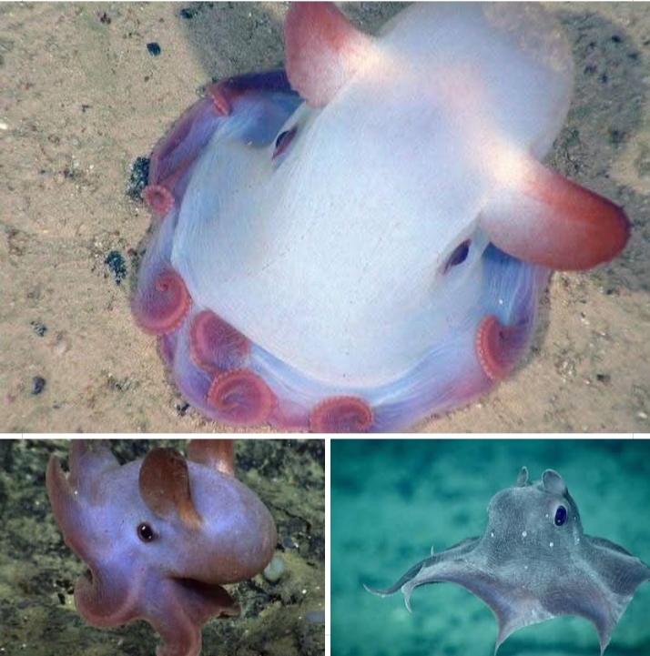 🐙الأخطبوط دامبو (Dumbo Octopus)مخلوق بحري عميق، ويُعد من ألطف وأغرب الكائنات البحرية بسبب زعنفتين تشبهان أذني الفيل، ما يعطيه مظهرًا جميلًا وغير مألوف. يعيش في أعماق كبيرة حيث الضوء شبه معدوم.يتحرّك بحركات ناعمة تشبه الطيران، ويتغذّى على الكائنات الصغيرة في قاع البحر. لا يمتلك حبرًا مثل باقي الأخطبوطات، ويعتمد على هدوئه وشكله للتخفي.ويُعد هذا الأخطبوط حساسًا جدًا للتغيرات البيئية في أعماق البحار، مما يجعله من المخلوقات النادرة التي تجمع بين الغرابة والجمالIsmail Zayed