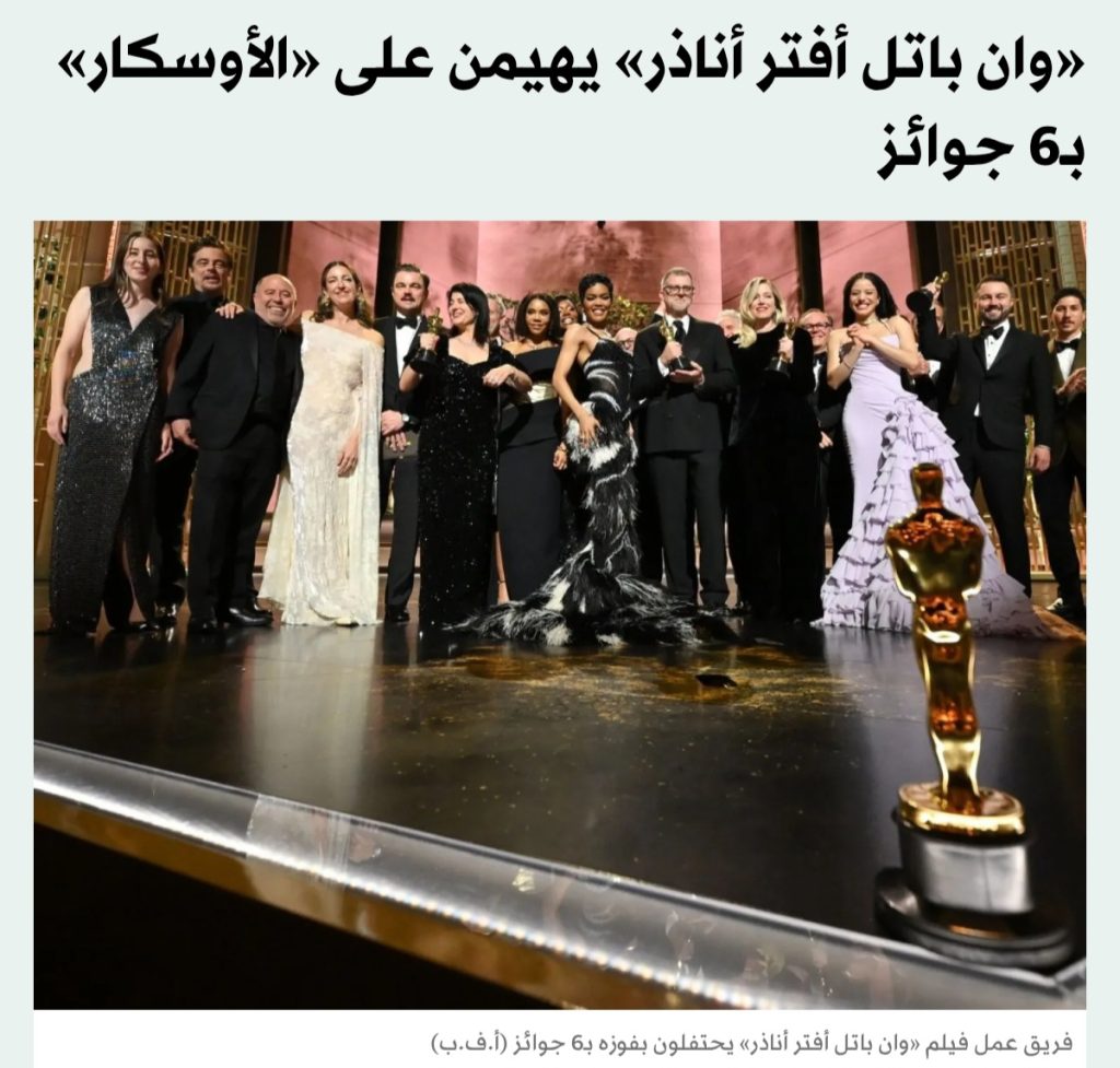 هيمن فيلم «وان باتل أفتر أناذر» على حفلة الأوسكار، أمس الأحد، بعدما حصد ست جوائز؛ إحداها في الفئة الرئيسية عن أفضل فيلم، متفوقاً على «سينرز»، في ختام أحد أكثر مواسم الجوائز تنافسية خلال السنوات الأخيرة.