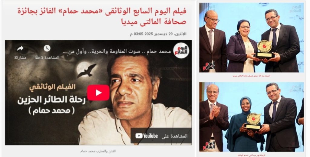 فيلم اليوم السابع الوثائقى «محمد حمام» الفائز بجائزة صحافة المالتى ميدياكتب ـ محمد عبد الرازقفاز الفيلم الوثائقي (“محمد حمام”.. صوت المقاومة والحرية.. وأول مَن طرق أبواب العالمية.. رحلة الطائر الحزين) ، بجائزة صحافة الوسائط المتعددة “مالتي ميديا”، حيث كرم خالد البلشي نقيب الصحفيين وأعضاء مجلس النقابة في احتفالية جوائز الصحافة المصرية الزميلتين منة الله حمدي، ونهير عبد […]