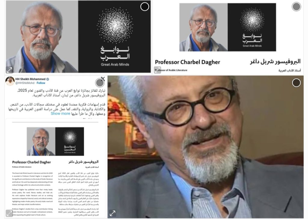 سمو الشيخ محمد بن راشد آل مكتوم،يعلن فوز اللبناني البروفيسور : شربل داغر، أستاذ الآداب العربية، بجائزة نوابغ العرب عن فئة الأدب والفنون لعام 2025م.