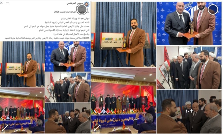 جائزة عالمية مع إشراقة العام الجديد 2026 تتوالى نعم الله وببركة أنفاس مولايالإمام الحسين وأخيه أبو الفضل العباس (عليهما السلام)حصلت على جائزة الأربعين العالمية الحادية عشرة بعمل عنوانه من البحر الى النحرالتي تقيمها وزارة الثقافة الإيرانية بمشاركة 47 دولة حول العالموقد بلغ عدد الأعمال المشاركة في هذه الدورة35,816 عملاً في محطة دولية تجسد عالمية رسالة […]