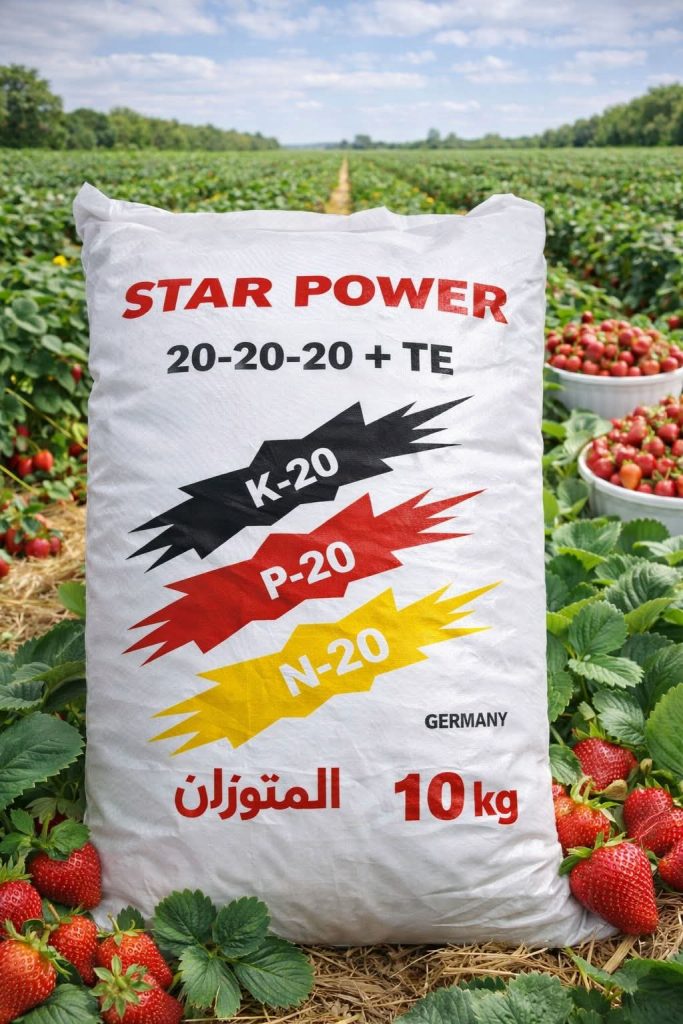 Star Poweأهمية السماد المتوازن سوبر باور (20-20-20) في حقول الفريز السماد المتوازن سوبر باور يُعد من أهم الأسمدة المستخدمة في زراعة الفريز، خاصة في مراحل النمو النشط، وذلك للأسباب التالية:🌿 1. نمو خضري قوي ومتوازنالنيتروجين (N) يساعد على تكوين أوراق قوية وكثيفةيحسّن كفاءة البناء الضوئي، ما ينعكس على قوة النبات🌸 2. تحفيز الإزهار وتكوين الجذورالفوسفور […]