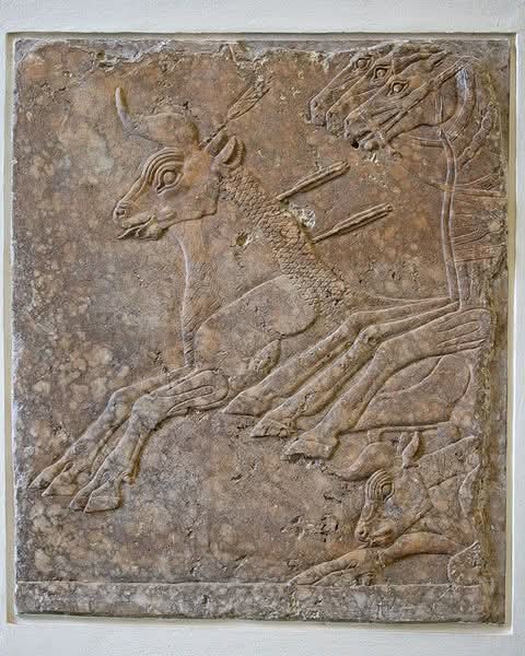 لوح مرمري يمثل مشهد ملكي لرحلة صيد غزلان.
