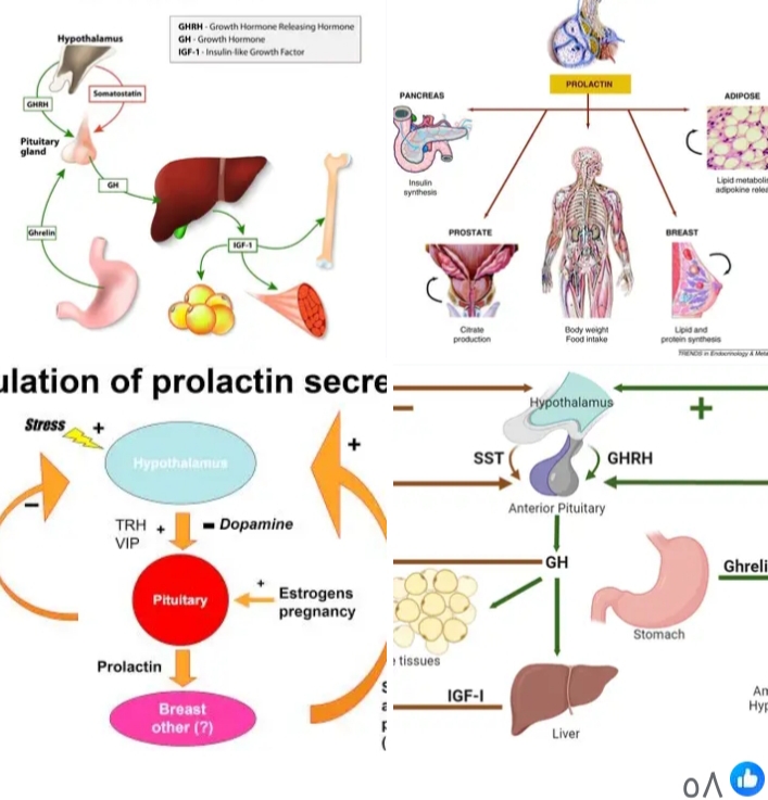 التنظيم والوظائف الحيوية لهرمون النمو (GH) والبرولاكتين (PRL) ✅هرمون النمو🔹يفرز هرمون النمو (Growth Hormone) من خلايا تدعى somatotrophs في الغدة النخامية الأمامية تحت تأثير هرمونين من الوطاء هما (GHRH) الذي يزيد إفراز GH و(somatostatin) الذي يثبطه. يحدث الإفراز بشكل نبضي (pulsatile secretion) ويزداد أثناء النوم والإجهاد. 🔹هرمون المعدة ghrelin يعزز إفراز GH ويعمل مع GHRH […]