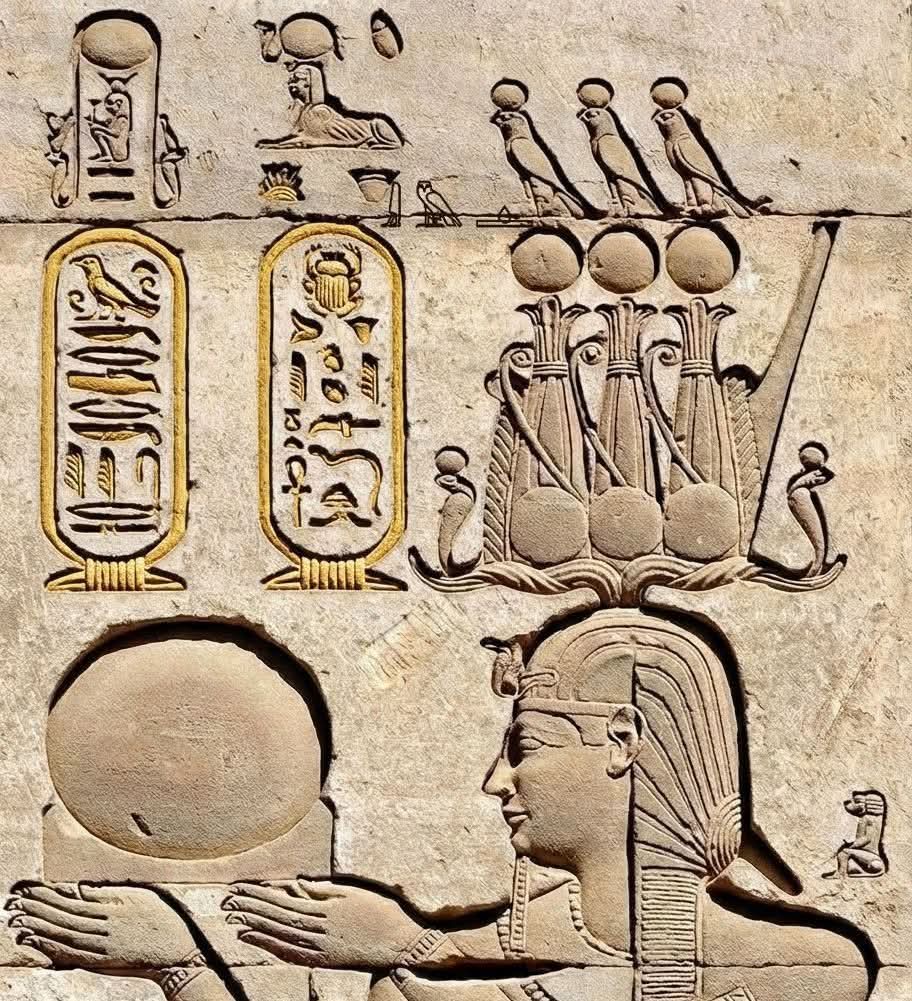 المكان: معبد إسنا / كوم أمبو (الفن المصري في العصر الروماني).تظهر هذه اللوحة من عصر الإمبراطورية الرومانية فى عهد الإمبراطور تراجان يعتبر نغسه كفرعون مصري أصيل. تحليل الرموز:1- الخراطيش الملكية (الأسماء):- * الخرطوش الأيمن: ينطق (قيصر – Kaisaros)، وهو اللقب الشهير لأباطرة روما. * الخرطوش الأيسر: ينطق (أوتوكراتور – Autokrator)، وهي كلمة يونانية مكتوبة بالهيروغليفية […]