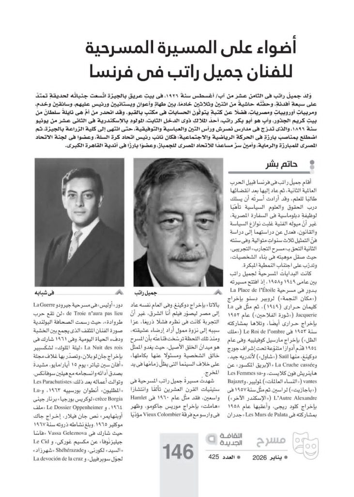 بقلم حاتم بشر شهدتُ مسيرةُ جميل راتب المسرحية فى ستينيات القرن العشرين تألقًا وانتشارًا واسعين، فقد مثّل عام 1960 فى Hamlet «هاملت» بإخراج موريس جاكومو، وظهر فى وارسو مع فرقة Vieux Colombier مؤدّيًا دور «أوليس» فى مسرحية جيرودو La Guerre de Troie n’aura pas lieu «لن تقع حرب طروادة»، حيث رسمت الصحافة البولندية صورة الفنان […]